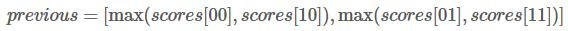 那么我们的previous=[0.5, 0.4]其含义可以这样理解:其中从w_{\! 0}预测w_{\! 1}分别归属于L1的概率为\! 0.2和\! 0.5;最高得分为\! 0.5(即对应路径表现为L\!_2 \rightarrow L\!_1),类推地L\!_2 \rightarrow L\!_2的得分为\! 0.4.