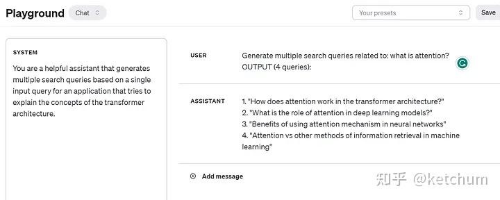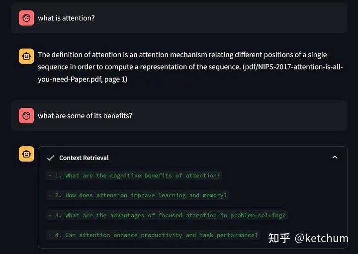 当您的内容中含有过多专业术语或与知名品牌的语言高度相似时,请考虑调整RAG融合提示以优化性能效果;或者最好尽量避免使用此类技术。以下将通过一个具体案例来说明这一观点。目前所有知名的大语言模型(LLMs)都源自于'注意力机制即为所需'这篇论文中首次提出的Transformer架构模型;这是一项衡量在生成下一个词时各个上下文单词重要性的方式;因此,在基于上述论文构建一个支持RAG功能的应用时(绿色字体用于标识那些为该功能做出贡献的语言模型所生成的问题),其运行逻辑可能类似于以下情况: