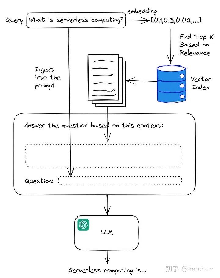 RAG的架构示意如下, 简而言之, RAG就是通过检索获取相关知识并融入Prompt, 使大模型可借助这些知识提供合理的回答。其核心在于'检索+生成', 其中, 前者主要依靠向量数据库的高效存储与检索功能来实现目标知识的召回; 而后者则利用大模型与Prompt工程将召回的知识进行合理运用以生成目标答案。