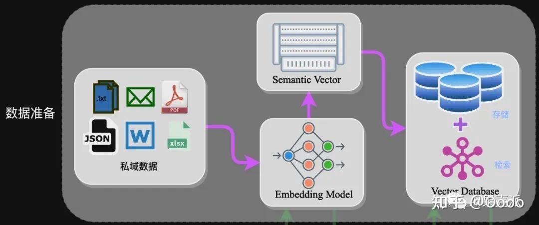 在大多数情况下,数据准备被视为一个非实时处理的任务,在这一过程中主要目的是将私域资产转化为可量化形式,并建立索引机制;随后将其存储于数据库中以便快速检索。具体包括以下几个步骤:首先进行数据提取;接着对文本进行分词处理;随后将其转化为数值形式;最后完成数据存储工作。