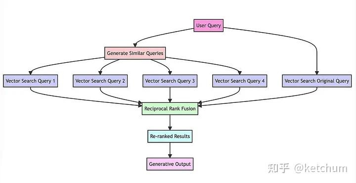 下图大致呈现了整体工作流程。该图表的核心步骤是通过LLM产出多个相关查询,并旨在使问题的不同方面在上下文中得到体现。随后你可依据这些生成结果执行向量搜索(如前述部分所述),并根据其在结果列表中的呈现位置对其进行重新排列。