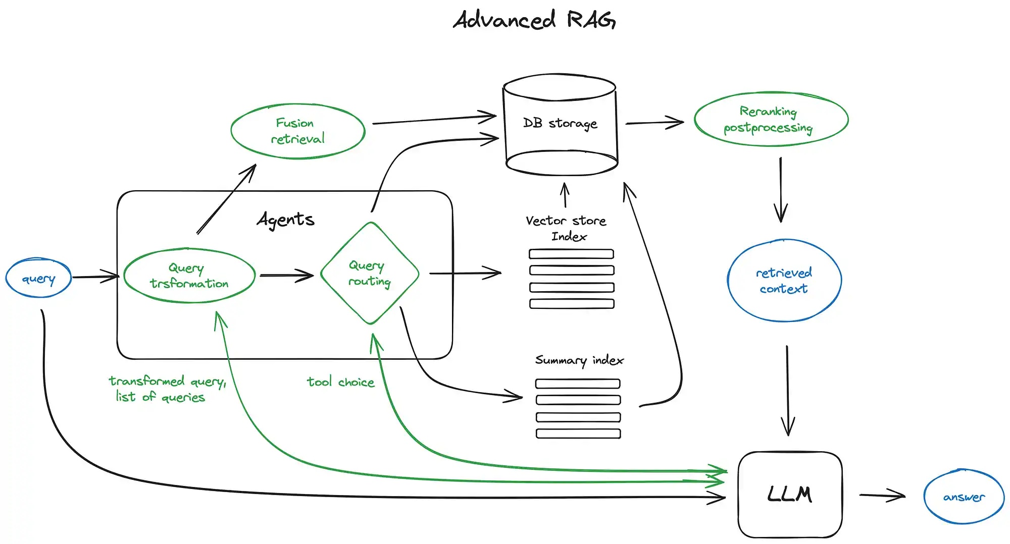 目前我们致力于详细阐述高级 RAG 技术方案。该方法将涵盖其中的关键步骤与算法设计,并着重说明其核心原理与实现细节。值得注意的是,在此过程中我们将暂时跳过复杂的循环逻辑以及多级代理机制, 以确保叙述的清晰明了