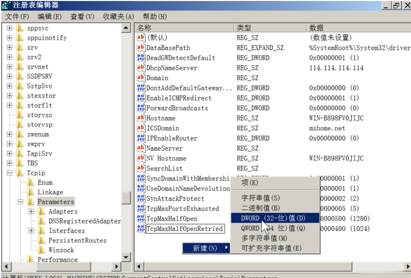继续新建 DWORD(32-``位``)``值 ,名称为 TcpMaxHalfOpen ,值为 500