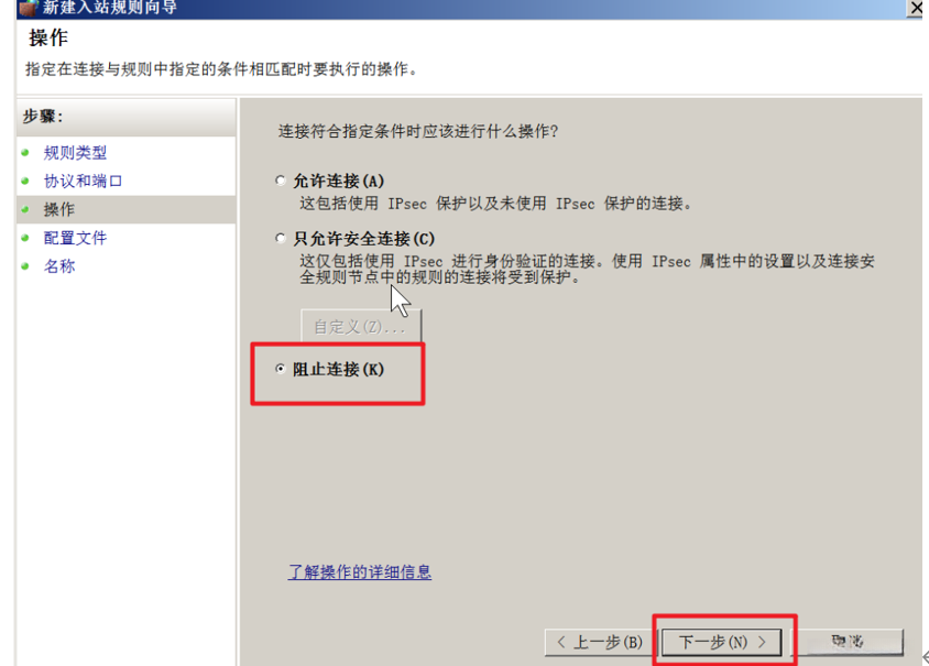 阻止连接,下一步,以后一直下一步设置名字完成即可
