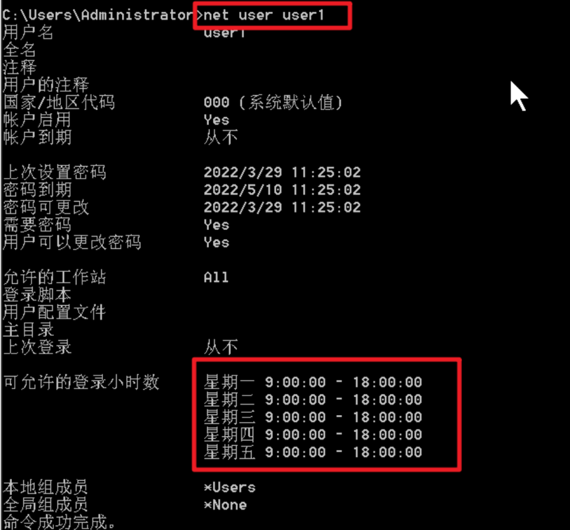 a. 配置user1用户的登录时间为工作时间段(每日上午9点至下午6点之间可以访问;生成并保存该用户的登录时间设置界面截图)