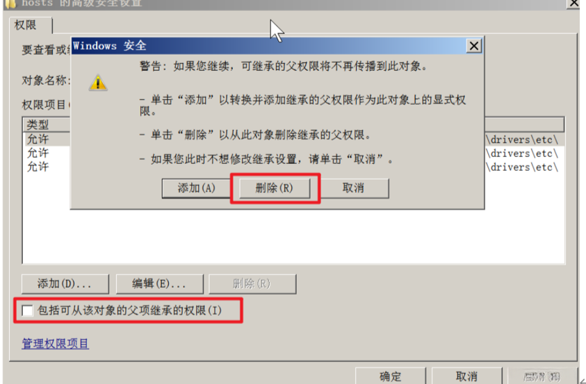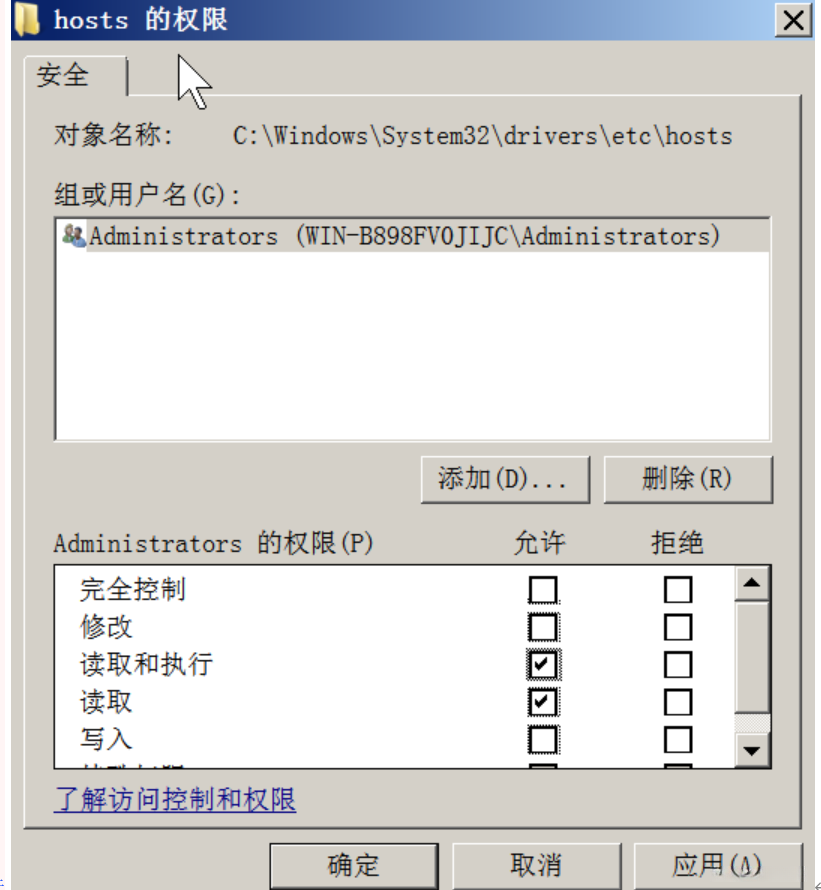 执行新增操作时,请将 Administrator 组包含进去,并分别将其权限设为 读取和执行。
