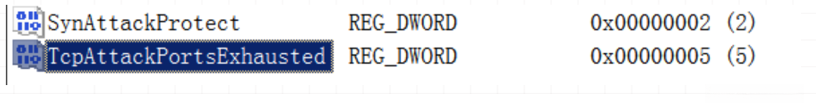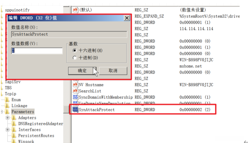 右击空白区域后的新窗口中新增DWORD(32-位)值名称为SynAttackProtect