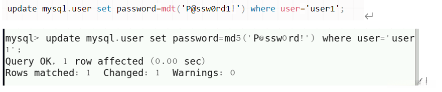 6.使用mysql内置MD5加密函数加密用户user1的密码为(P@ssw0rd1!)。