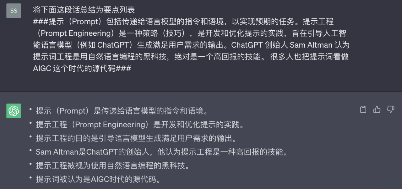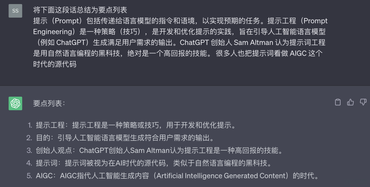 - 提示(Prompt)包括传递给语言模型的指令和语境,以实现预期的任务。提示工程(Prompt Engineering)是一种策略(技巧),是开发和优化提示的实践,旨在引导人工智能语言模型(例如 ChatGPT)生成满足用户需求的输出。ChatGPT 创始人 Sam Altman 认为提示词工程是用自然语言编程的黑科技,绝对是一个高回报的技能。 很多人也把提示词看做 AIGC 这个时代的源代码