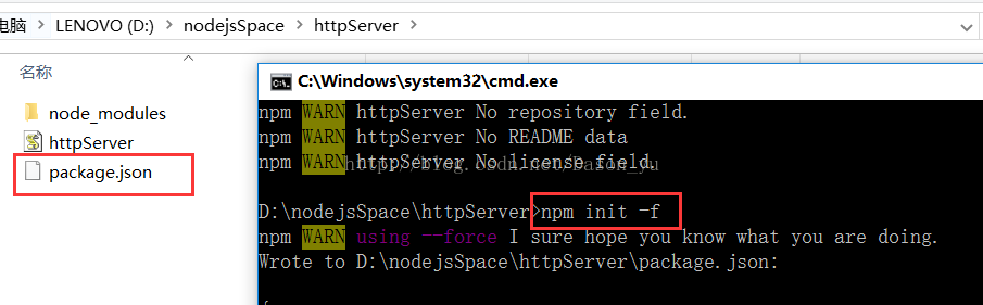 在操作过程中遇到了提示信息显示缺少package.json 文件。只需运行 npm init -f 命令即可自动生成该文件。