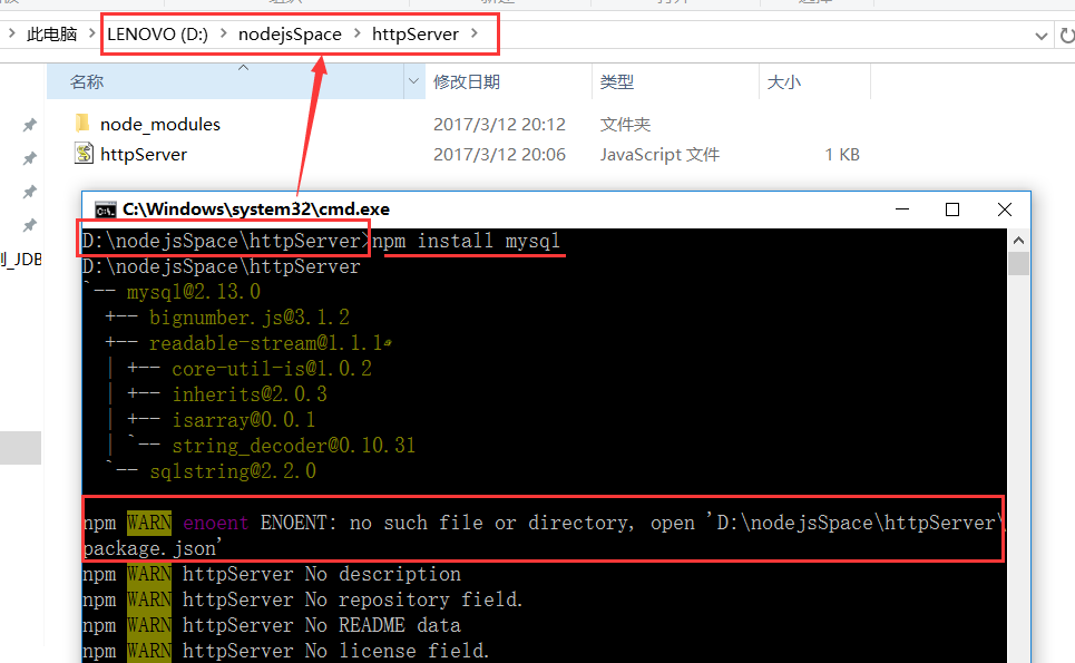 命令:npm install mysql, 会生成 node_modules 文件夹 , 如图