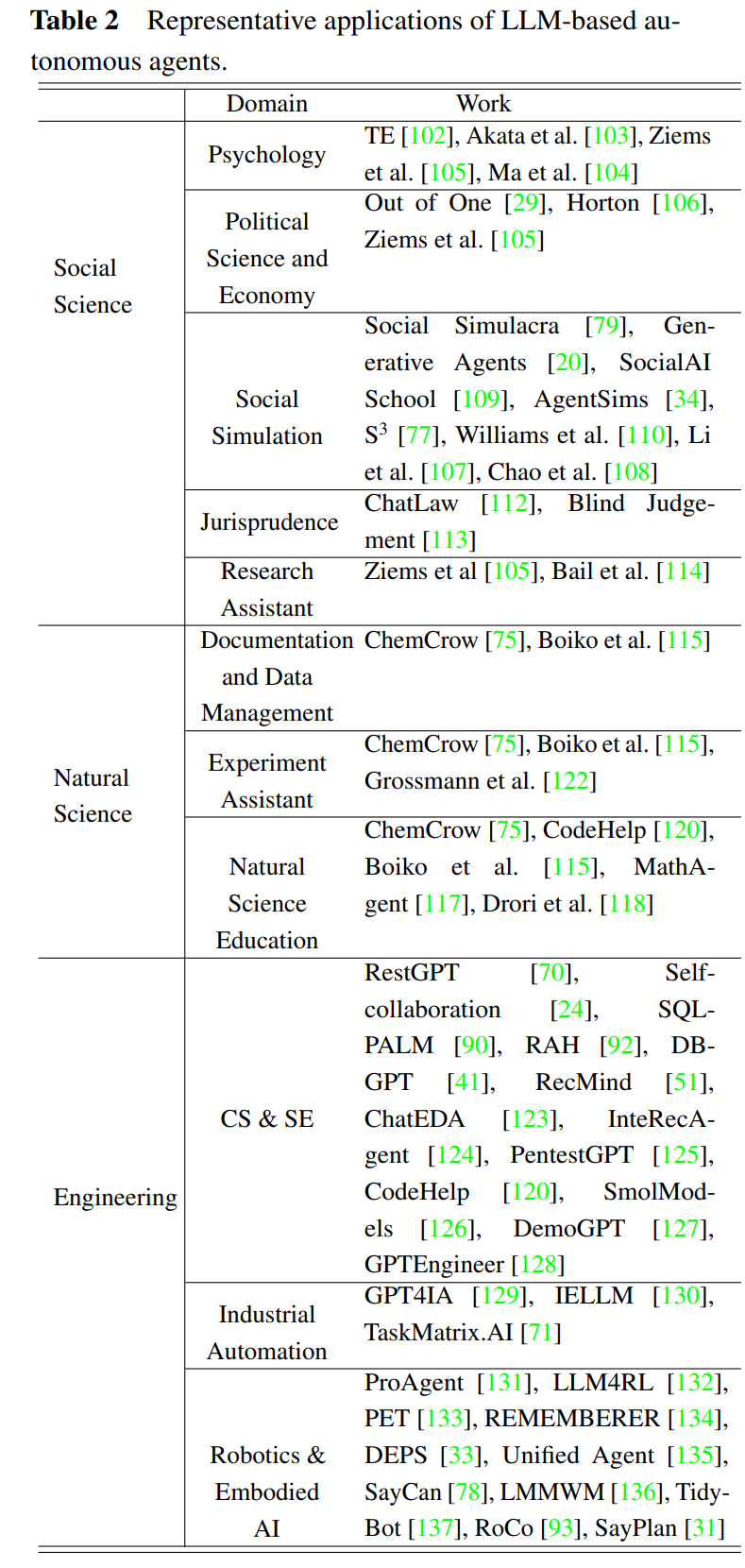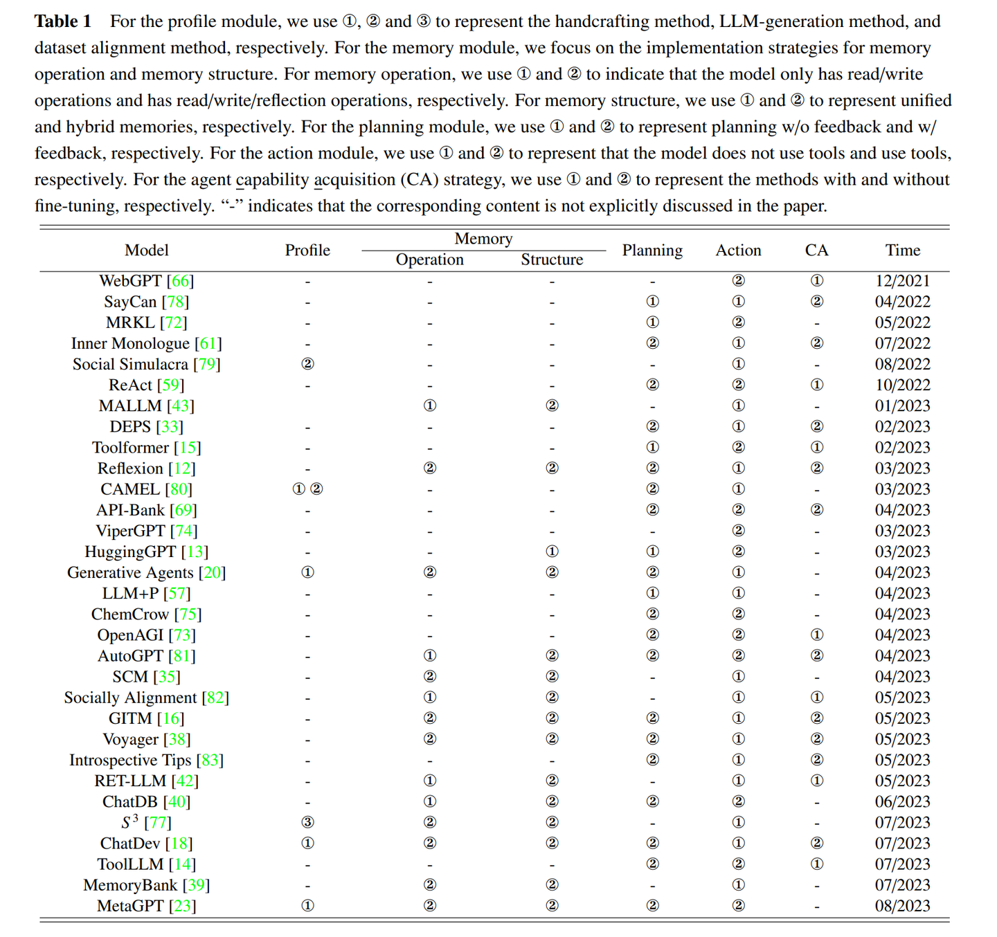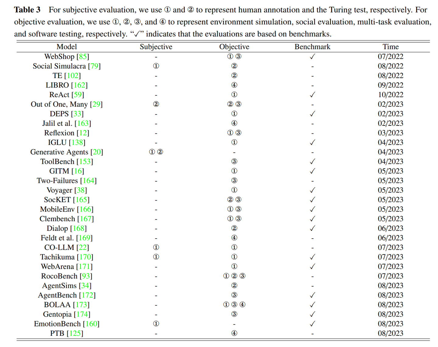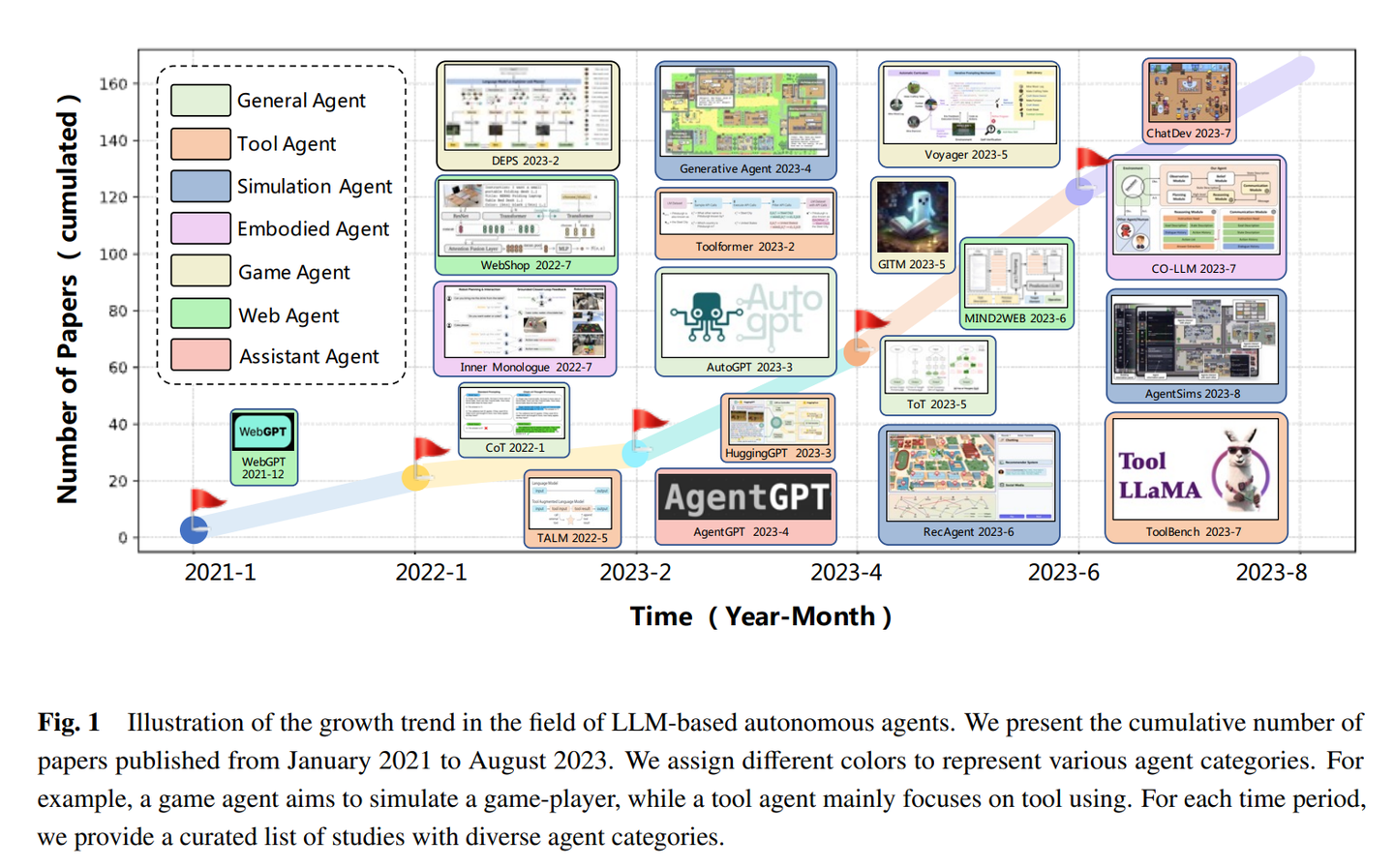 此图表展示了基于大型语言模型(LLM)在自主智能体领域的发展趋势图。通过不同颜色标记法区分出各类不同的智能体类型。我们统计并展示了从2021年1月至2023年8月期间发表的所有学术论文的数量,在每个时间段内部分析的基础上整理出了一个精选的研究清单。例如,在游戏智能体方面的主要目标是模拟真实玩家的行为模式,并关注其决策过程中的心理活动和策略选择;而工具智能体则主要聚焦于工具的操作方法、性能优化以及在特定场景下的效率评估等关键指标