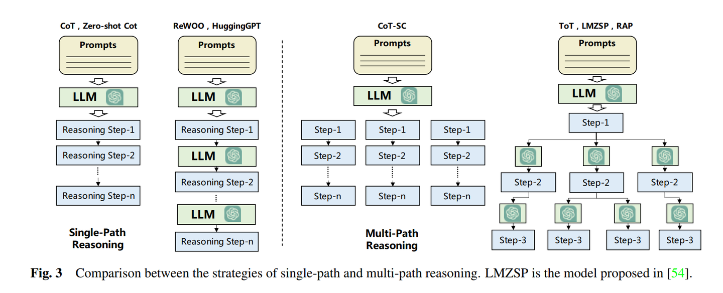 在这种策略中,推理过程被组织为树状结构。每个中间步骤可能包含多个子步骤。这种策略类似于人类的思维模式,在每一个推理阶段可能存在多种选择可能性。具体而言,Self-consistent CoT (CoT-SC) [49]认为每个复杂问题都可通过多种思考路径推导出最终答案。因此它首先利用CoT生成各种推理路径及对应答案选项随后则选取出现频率最高的答案作为最终输出结果Tree of Thoughts (ToT) [50]旨在通过树状推理结构生成计划方案在这种方法中树形图中的每一个节点代表一个"思想"即一个中间推理阶段这些阶段的选择均基于LLMs的评估结果最终形成的计划方案则是通过广度优先搜索(BFS)或深度优先搜索(DFS)策略完成的与CoT-SC不同后者会一次性生成所有计划步骤而ToT则需要为每一个推理阶段单独查询LLMs系统在RecMind [51]中作者引入了一种自我激励机制该机制可使规划过程中被丢弃的历史信息得以用于推导新的推理阶段信息在GoT [52]中作者将ToT中的树状推理结构扩展至图状结构从而提升了提示策略的效果在AoT [53]中作者提出了一种新型方法即将算法示例融入提示以增强LLMs的推理能力这种情况下仅需查询LLMs一两次即可完成规划任务在[54]研究中LLMs被用作零次规划者在此框架下规划者首先生成多个可能的后续行动选项然后根据这些选项与可接受行动的距离来确定最合理的后续行动方案为了进一步优化研究[55]提出应将与当前查询示例相似的历史示例纳入其中以提升规划效果RAP [56]则基于蒙特卡罗树搜索(MCTS)构建了一个虚拟世界模型用以模拟不同规划方案潜在的优势效果随后通过聚合多个MCTS迭代结果来生成最终的规划方案为了便于理解我们特别提供了单路径与多路径推理策略对比图(如图3所示)。