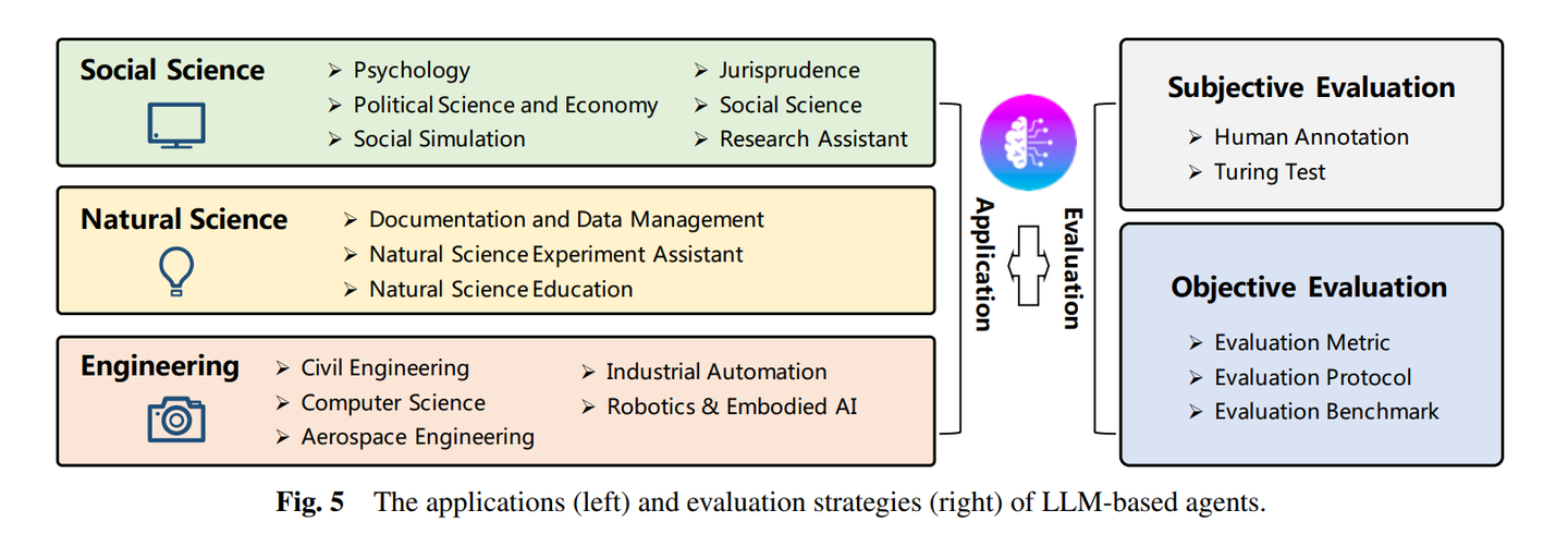在本文中,我们对基于LLMs的自主代理领域进行了系统性研究。具体而言,在三个维度上展开调查:代理的构建、应用与评估方面展开深入探讨。就代理构建而言,在两个关键问题上提出见解:(1)如何设计有效的代理架构以充分利用LLMs的能力;(2)如何通过激发和增强代理执行不同任务的能力来提升其性能水平。其中第一个问题主要关注于为代理建立硬件基础的支持体系;第二个则聚焦于提供软件资源以增强其执行能力。针对第一个问题我们提出了一种统一化的代理框架方案;针对第二个问题则对常见的能力获取策略进行了总结归纳。除了对代理构建的技术探讨外,在社会科学、自然科学以及工程学等多领域中也对基于LLMs的自主代理应用进行了概述介绍。最后部分深入分析了评估这类自主代理的有效策略,并特别强调了从主观感知角度与客观指标角度进行综合考量的重要性