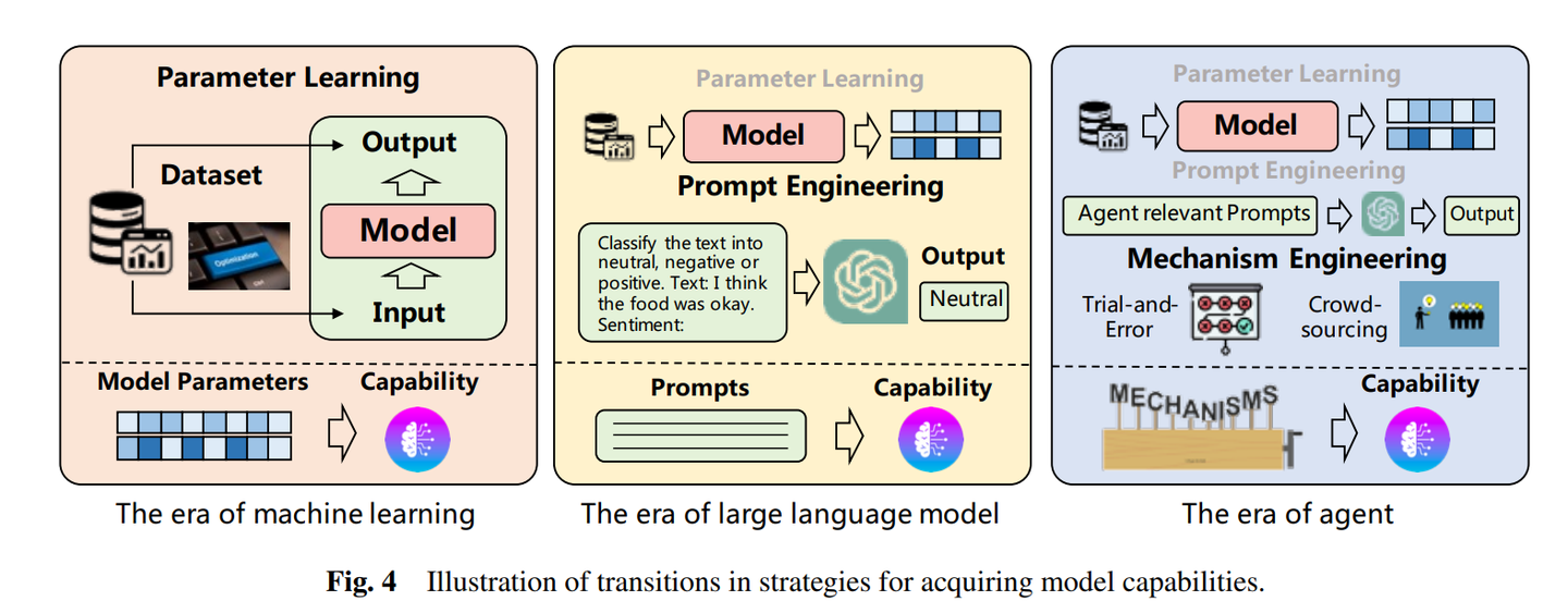 基于LLMs的人工智能代理旨在通过模拟人类能力有效地执行多样的任务。为了实现这一目标,我们需要关注两个关键要素:(1)如何设计适合LLMs的架构以最大化其潜力;(2)在选定架构后,如何使代理具备完成特定任务的能力。从架构设计的角度出发,我们对现有研究进行了系统综述,构建了一个完整的统一框架;针对第二个问题,我们根据是否对LLMs进行微调总结了代理能力获取的不同策略;将基于LLM的人工智能代理与传统机器学习体系进行对比,相当于是在构建代理架构时采用了网络结构设计的方法,而在获取代理能力方面则类似于参数学习的过程;随后我们将详细介绍这两个核心要素