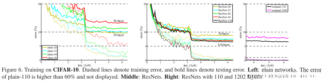 我们对n={3,5,7,9}进行了比较研究,并获得了从20层到56层的网络结构系列。以图6(左)为例,在plain网络架构中观察到随着深度增加,在trainig error上呈现出显著上升的趋势。这种现象与ImageNet(图4右)以及文献[41]中所展示的情况具有相似性特征,并揭示了一个关键性问题:过深的网络架构在优化过程中面临本质挑战。以图6(右)为例展示了ResNet的表现,在 ImageNet数据集上该架构通过有效的解决了这一挑战,并且随着深度增长其分类精度显著提升。