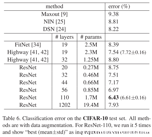 尽管模型规模较大(1202层),但仍存在一些尚未解决的问题。尽管两者的训练误差具有相似性(尽管两者都有类似的训练误差),但测试结果表明我们的110层网络表现更好。我们推测这可能与过拟合有关。对于该小数据集而言,这样的网络规模(19.4 million parameters)显得有些过大。通过应用maxout[9]或dropout[13]等强正则化手段,在该数据集上可以获得更好的效果(如[9,25,24,34]所展示的)。在本文中,默认情况下我们未采用maxout或dropout,并且仅通过设计将正则化机制融入网络架构中。这种做法是为了避免分散对难以优化问题的关注度量标准,在未来研究中可能会考虑结合更强的正则化方法以进一步改善效果