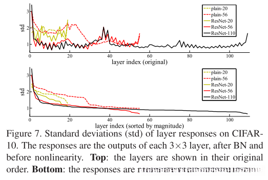 In real cases, 在实际情况中,在大多数情况下, it is unlikely that identity mappings are optimal." 这意味着恒等映射并非最佳选择。然而, 我们的重新表述可能会帮助预处理问题." 如果最优函数与恒等映射的距离比零映射更近", 那么求解器更容易通过相对于恒等映射来找到扰动", 而不是将函数作为新的一个来学习." 实验结果(图7)表明, 学习到的残差函数通常具有较小的响应值", 这表明恒等映射能够提供合理的预处理效果."