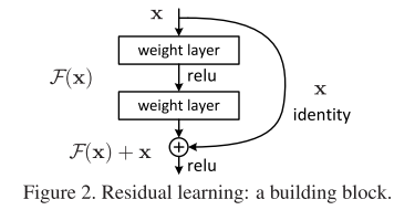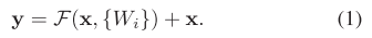 F(x)+x可以通过前馈神经网络中的跳跃连接(shortcuts)来实现(如图所示)。这种跳跃连接设计允许直接将输入信号传递到更深的层次而不经过中间层处理,在本案例中仅实现了简单的恒等映射功能;将这些中间输出结果与后续叠加层的结果相加以提升整体表现。值得注意的是该方法既未引入额外参数也未增加计算复杂度;同时整个网络依然能够采用反向传播结合随机梯度下降法进行端到端训练并支持像caffe这样的公共框架实现而不必修改求解器设置