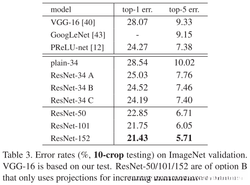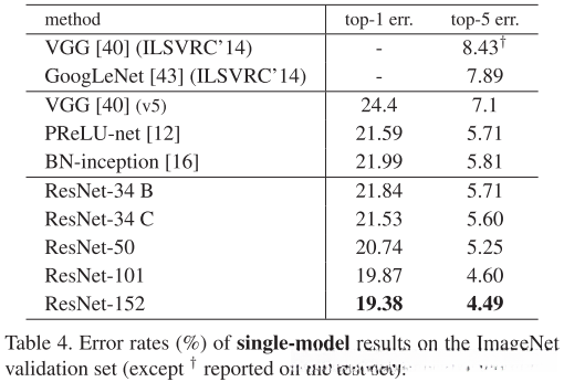基于更多三层残差块构建的 101 层及 152 层 ResNets:通过引入更多残差块构建了 ¹⁰¹ 和 ¹⁵² 层 ResNet 模型,在即便深度显著提升的情况下(尽管其复杂度仅为约 ¹¹³ ×10^9 次 FLOPs),其复杂度仍低于 VGG-¹⁶/¹⁹(分别约为 ¹�³ 和 ¹�⁶ ×10^9 次 FLOPs)。相较于仅包含 ³⁴ 层、50 层、₁₀₁ 层和 ₁₅₂ 层的 ResNets 的表现而言(表3 和表4),这些模型在分类精度方面表现更为出色,并且未观察到任何退化迹象;由此可得,在增加网络深度的过程中获得了显著提升了分类精度的优势。
