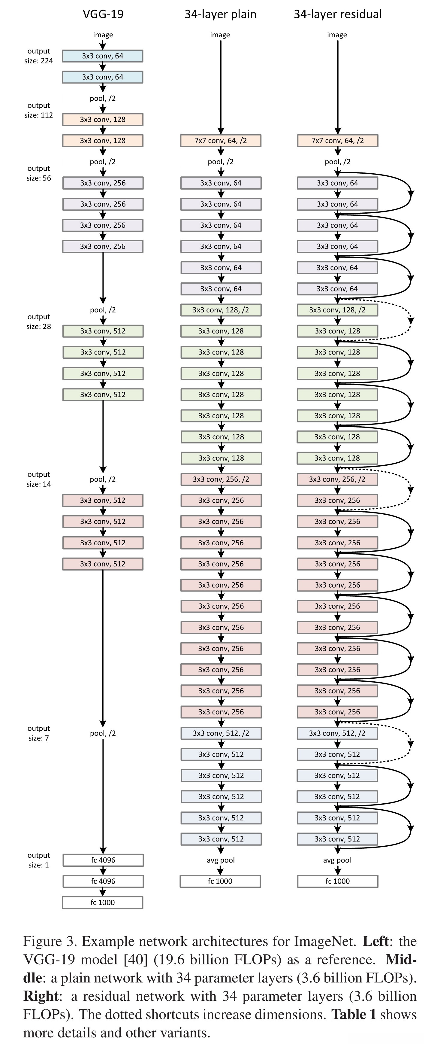 Plain Network. 基于图3中间的结构作为基准模型(Plain Network),这一设计主要受到图3左边VGG网络的启发。采用3×3卷积核设计,并遵循以下两个基本原则:首先,在保持输出特征图尺寸一致的情况下,各层使用的滤波器数量相同;其次,在减少特征图尺寸时(即进行下采样操作),滤波器数量相应增加一倍以维持计算效率。在实现下采样过程中,默认使用步长为2的一系列卷积操作。网络架构随后接续了一个全局平均池化层(Global Average Pooling),并以一个包含1000个神经元的一层全连接(Fully Connected)神经网络完成最终输出。如图3所示,在中间部分包含共计34个具有权重连接的神经元层。