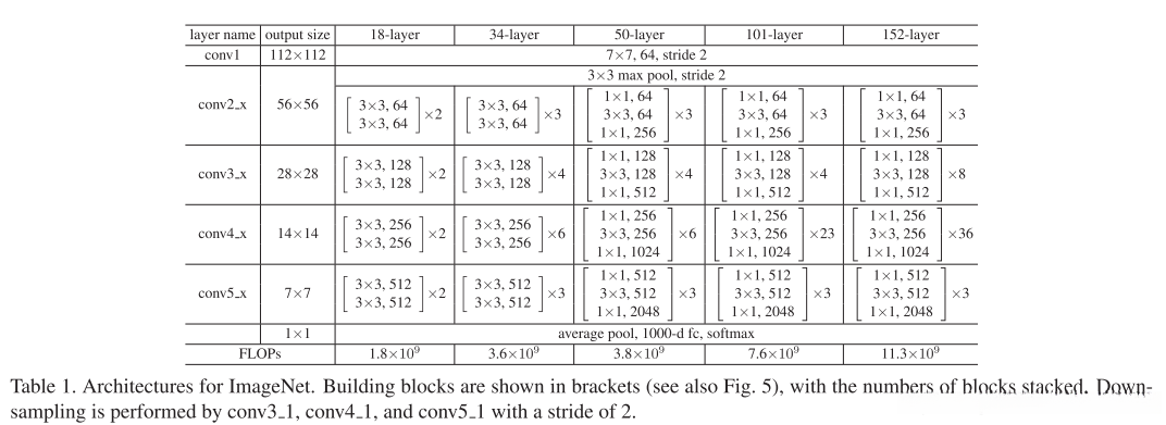 50-layer ResNet: 将34层ResNet中的2个残差块升级至3个以实现50 layer ResNet结构(表1),通过选择方案B来提升模型维度该模型具有约38 billion FLOPs