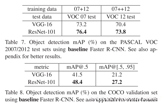 本方法在其它识别任务中具有良好的泛化性能。表7和表8显示了PASCAL VOC 2007 and 2012年[5]和COCO[26]的目标检测baseline结果。我们采用Faster R-CNN[32]作为检测方法。这里我们感兴趣的是用ResNet-101替换VGG-16[40]之后的改进。使用这两种模型的检测实现(见附录)是相同的,因此只能将增益归因于更好的网络。最值得注意的是,在具有COCO数据集上,我们获得了COCO标准度量(mAP@[.5,.95])6%的提升,相对提高了28%,这个增益仅仅是由于学习的表征(This gain is solely due to the learned representations.)。