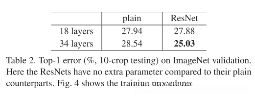 随后评估了18层和34层的ResNet架构。其基础结构与 plain 网络保持一致,在每两个 3×3 滤波器之间增加了跳跃连接机制(图3右)。在初步对比实验中(表2及图4右),通过恒等映射的方式,在维度扩展时采用补零策略,并将平移操作替换为跳跃连接方式处理特征映射间的差异。研究发现了以下三点关键结论:第一点是基于深度学习的残差网络相较于较浅版本表现更为优异(测试集准确率提升约2.8%),且其训练误差与验证误差之差显著缩小;第二点是经过深度学习训练后残差网络表现出更优的 top-1 错误率(表2显示减少了约 3.5%);第三点是相较于 ResNet 结构 plain 网络,在较浅深度下同样能够获得较高的分类精度,并且残差网络具有更快的收敛速度。