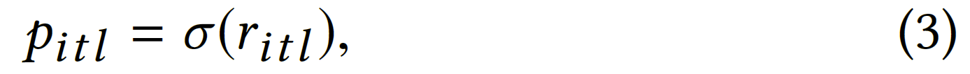 其中,σ代表sigmoid函数,r_{itl}定义为用户i在时间点t对物品l的预测得分为,其计算公式为。