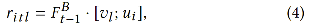 在推理过程中,可以通过对所有物品 ℓ 的分数r_{itl}进行排序,并推荐排序列表中的前K个物品,以帮助用户i在时间t获得前K个推荐。