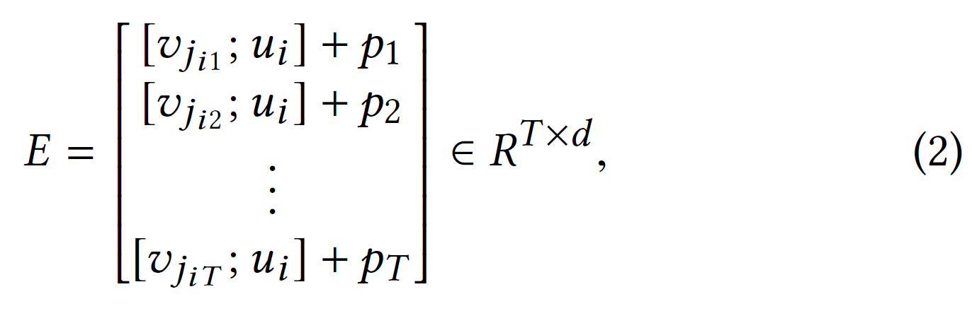 在本研究中,我们提出了一种可学习的用户嵌入查找表U∈R{n×d_u}和物品嵌入查找表V∈R{m×d_i},其中d_u和d_i分别代表用户和物品的隐藏单元数量。同时提出了可学习的位置编码表P∈R{T×d},其中d=d_u+d_i。每个输入序列s_i∈R{T}则通过以下嵌入表示完成。