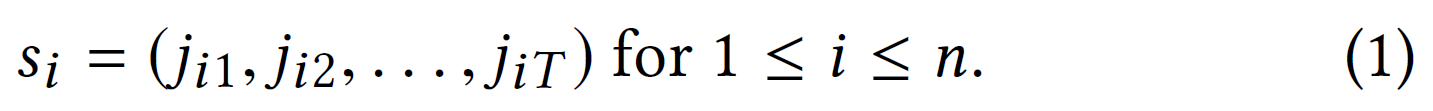 给定 n 个用户,每个用户按时间顺序与 m 个物品中的一个子集互动,顺序推荐的目标是,在任何给定时间点,为任何给定用户,学习在总共 m 个物品中前 K 个物品的良好的个性化排序。假设数据采用 n 个物品序列的格式: