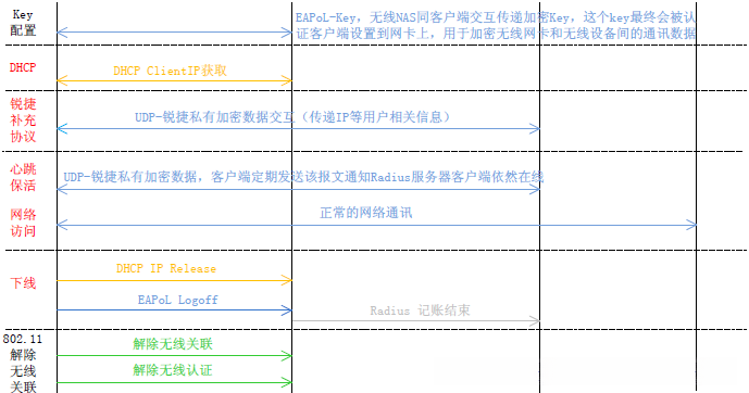 锐捷网络实现的无线PEAP协议交互过程基本上与标准PEAP交互过程相仿。然而,在无线PEAP认证过程中为了满足特定需求,在客户端与Radius服务器之间新增了相应的互动流程这一流程被统一称为"锐捷补充协议"