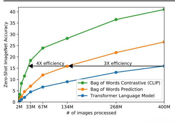 我们最初的类似VirTex的方法是从头开始联合训练一个图像CNN和文本Transformer来预测图像的标题。然而,我们遇到了扩展这种方法的困难。在图2中,我们展示了6300万个参数的Transformer语言模型,其计算量已经是ResNet-50图像编码器的两倍,学习识别ImageNet类别比一个简单得多的基线慢三倍,该基线预测相同文本的词袋编码。