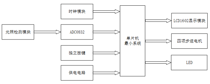 本系统采用STC89C52单片机作为核心控制器,与其他组件协同工作,完成太阳能电磁板的自动光轴跟踪功能。系统主要由中控模块、输入模块和输出模块三个部分构成。中控模块利用STC89C52单片机,负责接收输入模块的数据,并通过内部算法控制输出模块的运行。输入模块由四个子模块组成:时钟模块、光照检测模块、控制按钮模块和供电模块。其中,时钟模块用于获取当前时间信息;光照检测模块包括四个方位的光照传感器和ADC0832采样电路,用于检测东西南北四个方向的光照强度;控制按钮模块提供独立的按键,支持模式切换功能;供电模块则为整个系统提供稳定的电源。输出模块同样由三个子模块组成:显示模块、驱动模块和指示模块。显示模块采用LCD1602,可显示电磁板的方向、倾角、当前时间以及运行模式;驱动模块配置两个ULN2003A步进电机,用于控制电磁板的方向和倾角;指示模块则通过LED指示设备运行状态,当光照强度低于设定值时,LED点亮,提示用户当前处于阴天状态。
