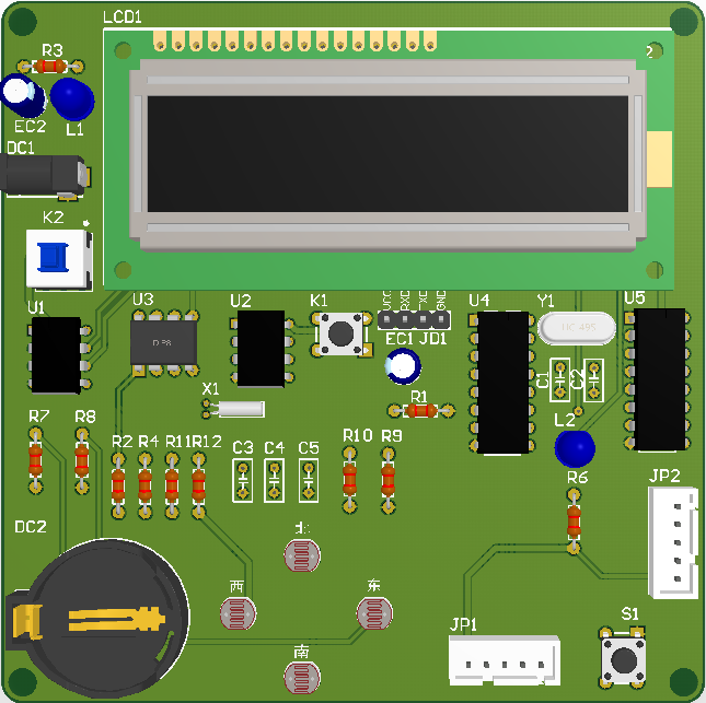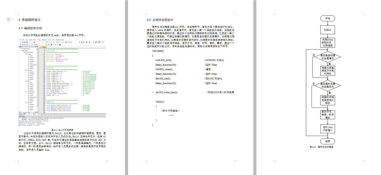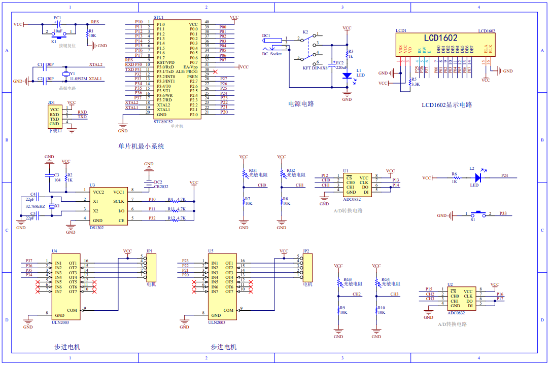 该系统通过LCD1602显示角度、方向、时间以及模式设置。系统具备自动模式(适用于晴天)与时间模式(适用于阴天)两种运行状态。在自动模式下,当四个光敏电阻检测到光照强度过低时,系统将自动切换至时间模式并点亮LED指示灯。在自动模式下,若某一方向的光照强度低于其他三个方向的设定阈值,方向步进电机将自动旋转至该方向。在自动模式下,角度步进电机将归零。而在时间模式下,角度步进电机将根据DS1302提供的实时时间进行调整。同时,方向步进电机也将归零。此外,DS1302的时间参数可通过串口进行配置(通过发送三个HEX数据,分别对应时、分、秒)。
