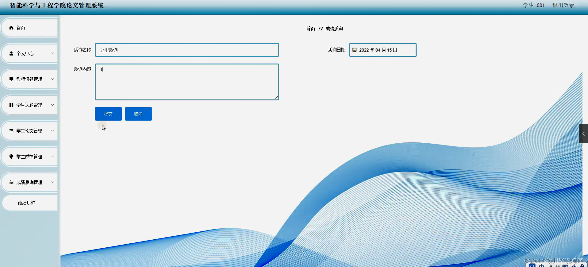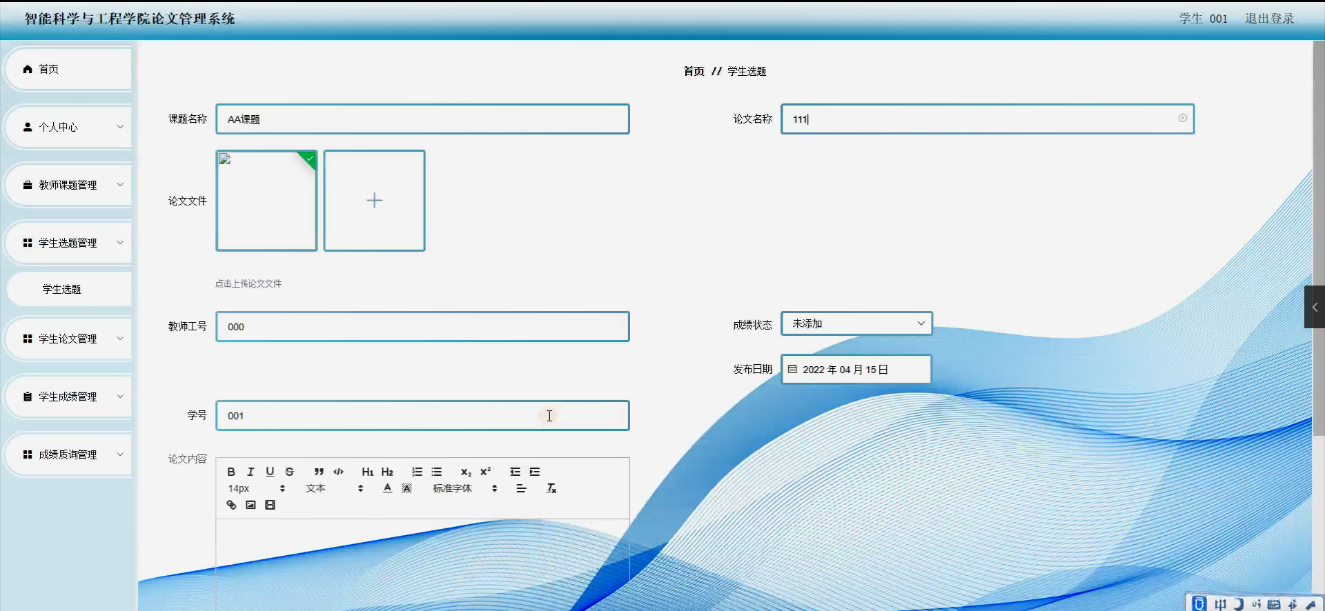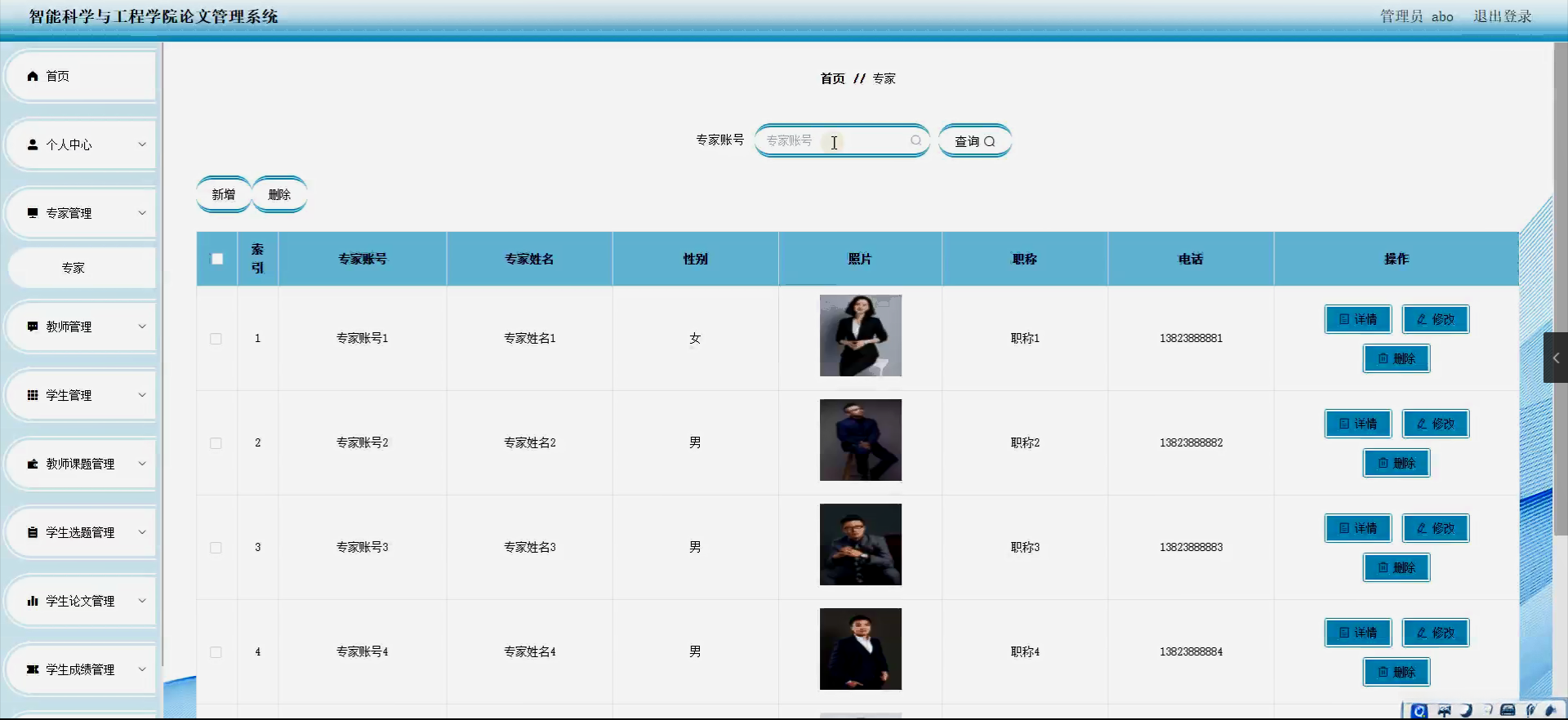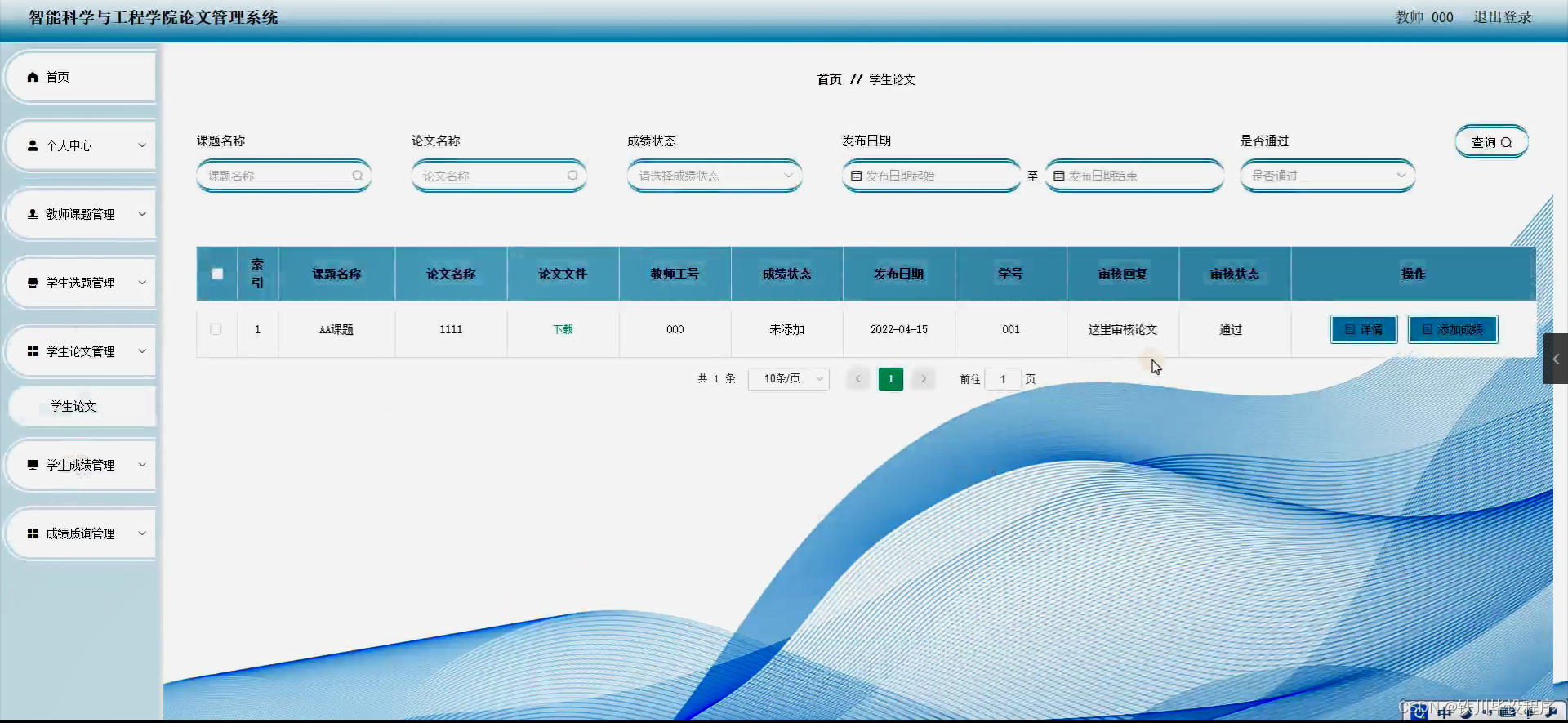 本研究主要聚焦于智能科学与工程学院的论文管理系统这一核心领域展开深入探讨。首先从系统功能入手对不同角色用户进行了功能划分其中专家可参与课题评审而指导教师则负责选题并对研究生的论文进行指导与评价研究生则可完成选题提交论文及查询成绩等相关操作。其次重点考察了系统的核心模块包括教师课题管理模块学生选题管理模块学生论文管理模块以及学生成绩管理模块确保各模块功能完善并实现高效协同运行此外还需注重系统的数据安全性优化其用户界面的人性化设计以提升易用性并保证系统的可扩展性以适应未来需求