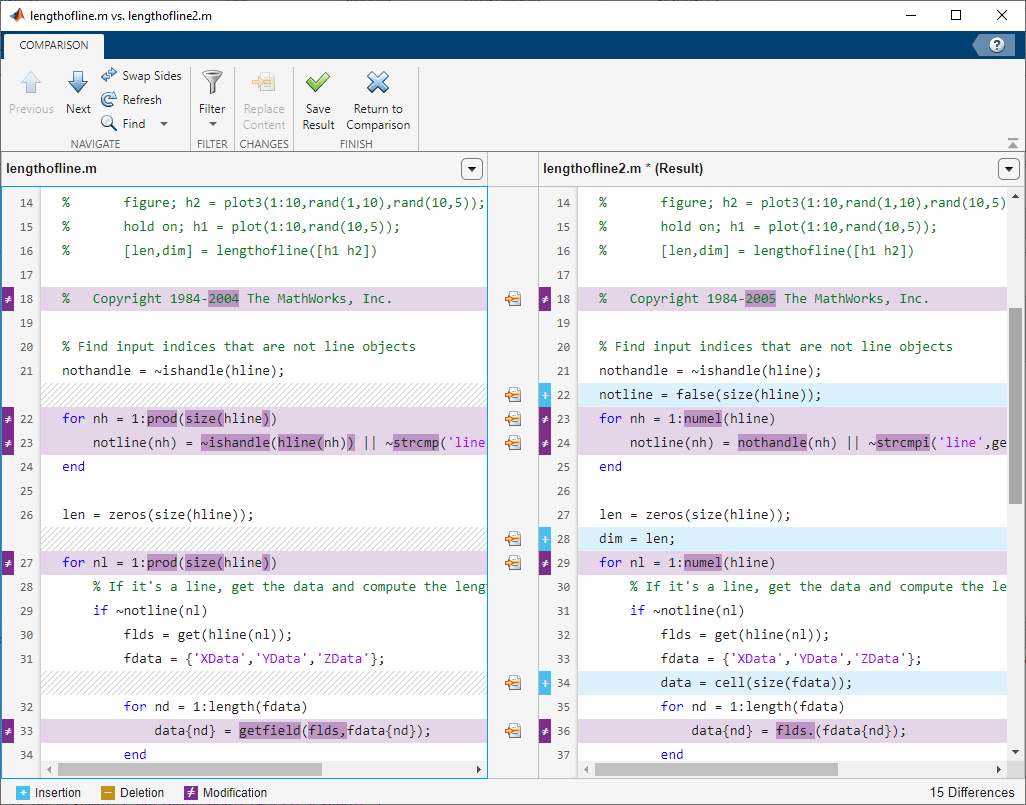 右窗格包含合并的结果。右窗格中合并文件名旁边的星号 (lengthofline2.m *) 表示该文件包含未保存的更改。