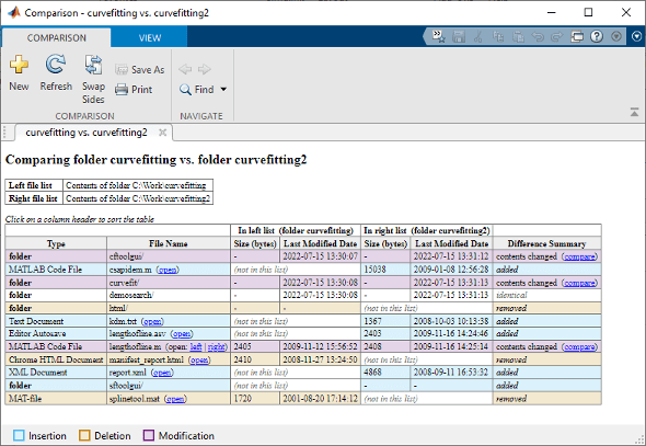 在执行文件列表比较时,将打开一个新窗口,并排显示指定列表的内容。例如,假设有两个文件夹 curvefittings 和 curvefittings2,二者之间有几处差异。在比较这两个文件夹时,比较工具会显示结果报告。