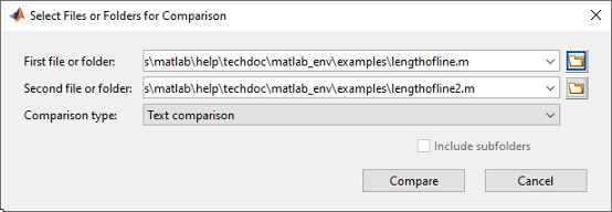 命令行窗口 - 使用 visdiff 函数。例如,要使用 visdiff 函数和默认的文本比较对 lengthofline.m 和 lengthofline2.m 这两个文件进行比较,请键入 visdiff('lengthofline.m','lengthofline2.m')。MATLAB 将打开比较工具并显示生成的比较报告。