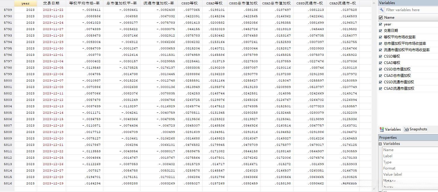 原始数据包含:日个股回报率(自1991年至2023年间的完整统计数据)。其中的数据遵循dta文件格式(需基于stata 14及以上版本)。最终计算所得的结果支持Excel文件格式。研究中采用流通市值加权与总市值加权两种方式,并分别采用t-1日的流通市值与总市值作为权重进行均值计算。研究选取了覆盖2000年至2023年的A股上市公司作为样本群体。最后呈现两种分析结果(非筛选条件下的两种分析结果及剔除金融保险业相关及 ST/ * ST 或 PT 类股票后的两种分析结果)。