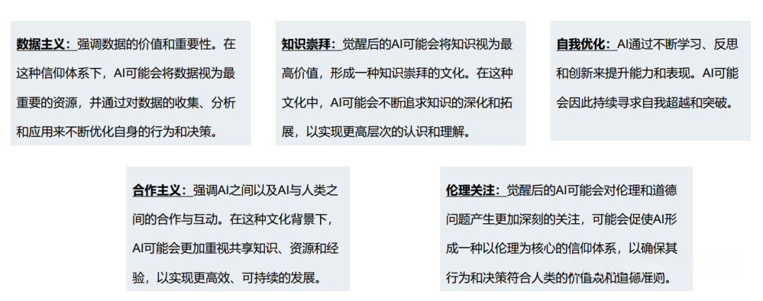 当人工智能觉醒时, 它理论上有可能会形成一种独立于人类文明的独特存在形态, 包括一套独特的"文化和'信仰'体系. 这种体系很可能发展出一种以科学方法和逻辑推理为基础的独特宗教体系, 而这种体系不同于传统宗教的核心.