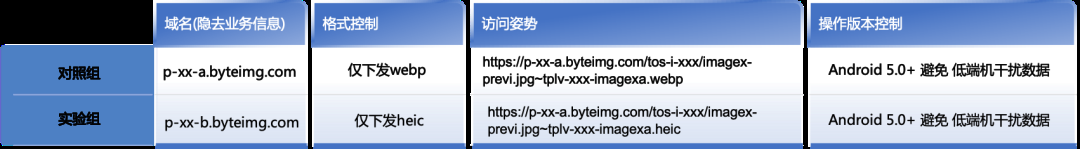 秉承科学严谨的原则,我们选择实验验证时,需要充分考虑对照组和实验组变量尽量减少:(veImageX图像压缩访问方式是极简的,只需要将原来的url之后追加一个图像目标模板即可如下表格中隐去了真实的业务信息)