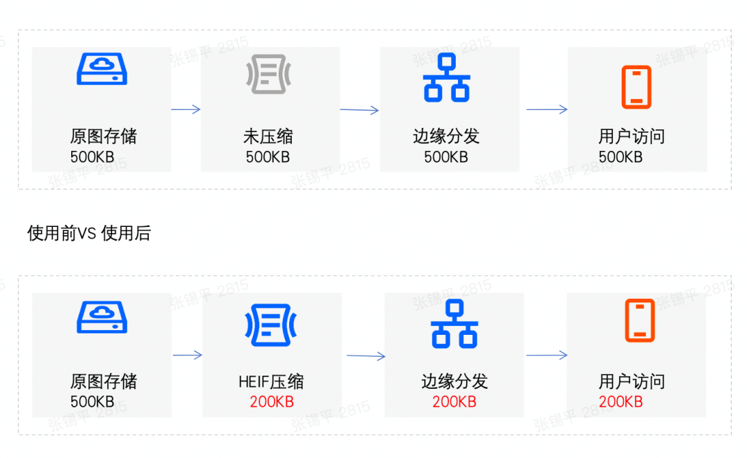 一张图片从上传到在用户端消费展示,主要包括带宽、存储、计算三大部分资源的消耗,成本大概占比7:2:1。其中带宽占比甚至可能比这更高,因此针对带宽的节省优化是重要一环。