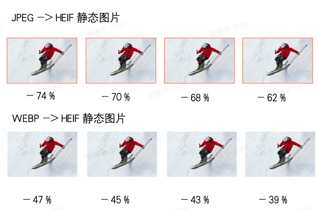 线上图像以各种形式存在:iOS 主要是jpeg格式、Android端以webp为主,以典型的jpeg、png、webp为例,实验室多次抽样验证发现,转换到我们自研的HEIF图片格式,体积可以节省30%以上。
