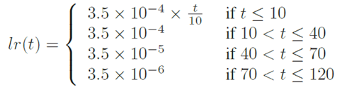 - 模型优化使用Adam。初始化学习权重设置为0.00035并分别在第40次与70次epoch时下降0.1。整体训练120个epochs。