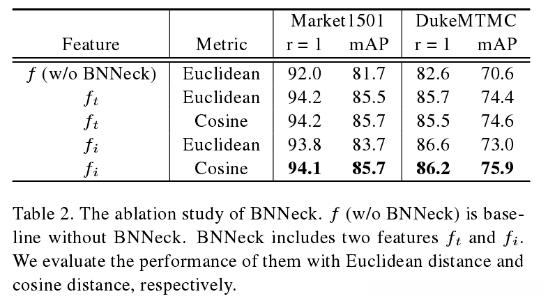 主要对加BNNeck后的ft、fi两个特征分别用欧式距离和余弦距离给出了实验结果。