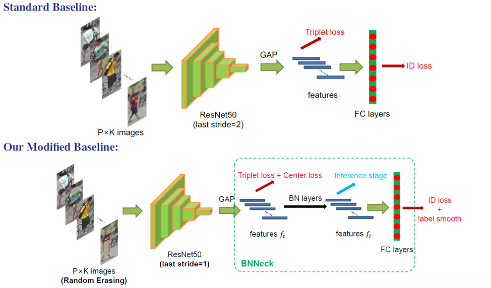 - 我们观察到ID丢失和三联体丢失之间的不一致,并提出了一种名为BNNeck的新型结构;