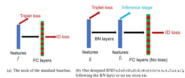 BNNeck仅仅在特征层后或者FC分类层后增加了一个BN层。BN层前的特征层表示为