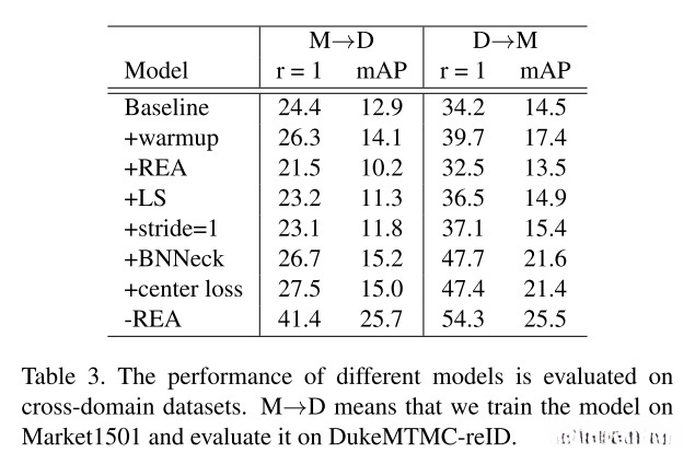 M-->D 表示模型在Market1501上训练,但在DukeMTMC-reID上进行评估。